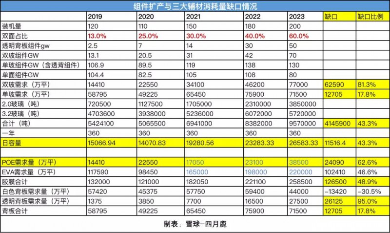 1)2021年起,雙玻組件采用一面eva一面poe計算,透背組件2021年開始全部按雙面eva算。