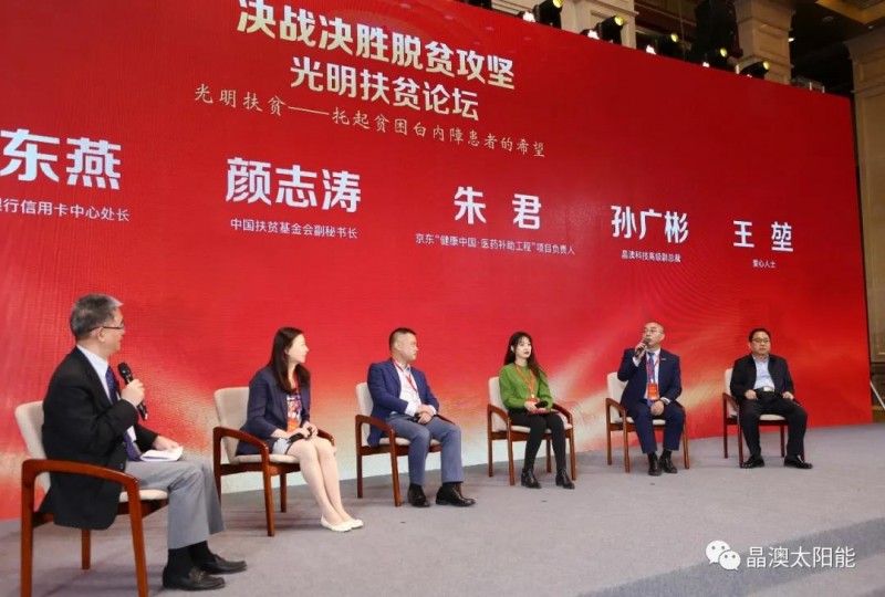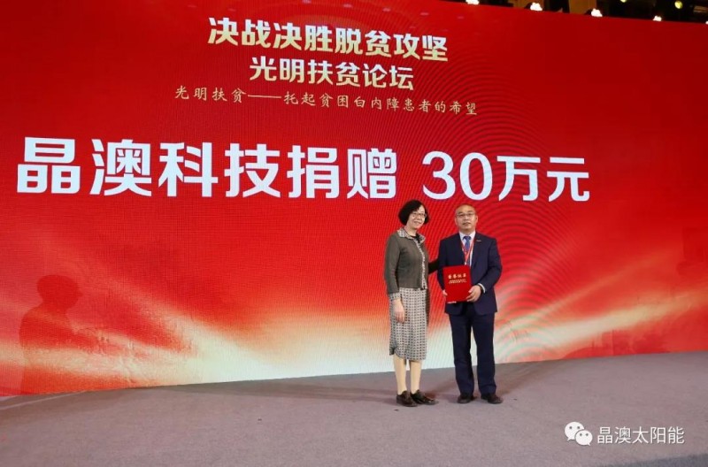 晶澳科技受邀參加論壇,高級副總裁孫廣彬代表公司向國家“光明扶貧工程”捐贈首批資金30萬元。晶澳“救助貧困白內障患者光明工程”正式納入國家扶貧工程。