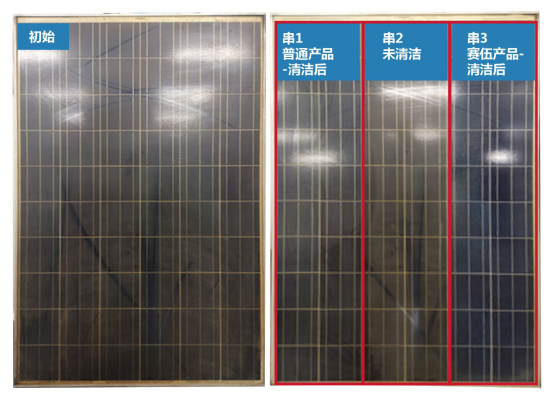 將組件根據電池排布及電學連接,分為3串,每串為相鄰的10片電池,共20片串聯連接的電池,對應接線盒內的一個旁路二極管。串1采用普通清潔產品進行清潔;串2未做清潔處理,便于清潔前后比對;串3采用賽伍的玻璃表面清潔產品CyClean-1。串1區域,采用普通清潔產品后,組件玻璃表面仍存在發黃現象。串3區域,采用賽伍清潔產品CyClean-1清潔后,玻璃表面不存在發黃的現象,表面生銹的物質基本已經清洗干凈。表1是串1和串3在清潔后的功率變化。可以看出,無論是賽伍清潔產品Cyclean-1還是普通清潔產品在清潔后, 組件功率都有一定程度的恢復。數據顯示,使用普通清潔產品后,功率恢復11.1%;采用賽伍產品清潔后,功率恢復19.2%,同比普通清潔產品增長73%。