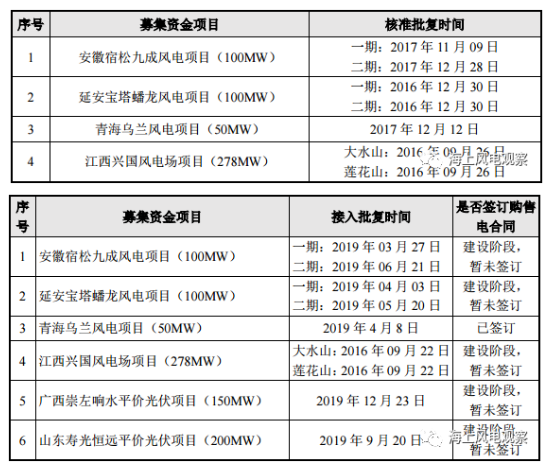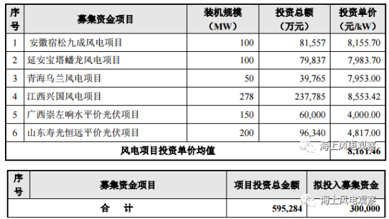 公告顯示,此次非公開發(fā)行股票募集資金不超過30億元,扣除發(fā)行費用后將用于投資建設(shè)安徽宿松九成風(fēng)電項目(100MW)、延安寶塔蟠龍風(fēng)電項目(100MW)、青海烏蘭風(fēng)電項目(50MW)、江西興國風(fēng)電項目(278MW)、廣西崇左響水平價光伏項目(150MW)、山東壽光恒遠平價光伏項目(200MW)及補充流動資金。