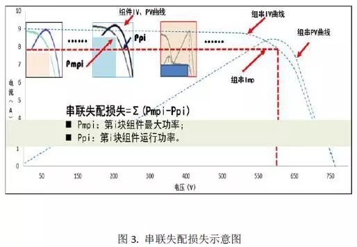 大的方面,組件最大功率的失配損失包括串聯失配損失和并聯失配損失,與單面發電相比,雙面發電需要特別注意的是串聯失配損失。圖3為組件最大功率串聯失配損失示意圖。從圖中可以看出,串聯失配損失的大小取決于組件IV的一致性。組件IV一致性受兩方面因素的影響,一是組件本身的性能一致性;二是運行環境的差異程度。對雙面發電,組件雙面受光和發電,性能一致性的影響因素存在疊加效應,失配損失會加大,電池串和組件被旁路的風險也在加大。