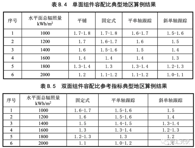 在剛剛批準并新實施的“能效標準”中,根據1)項目所在地的輻照度、2)項目采取的技術路線、3)項目采用的組件類型,對容配比采取了新的規定,最高可達到1.8:1,如表B.4所示。