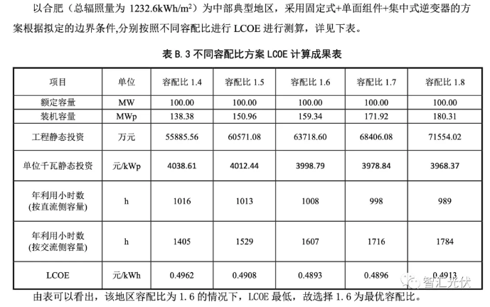 在不同容配比條件下,項目的度電成本會發生變化。新規范以合肥的項目為例,做了個典型案例的計算,如下表所示。