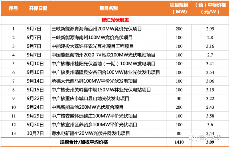 9月、10月開標的13個、總規模1.41GW的光伏項目,EPC價格如下表所示。