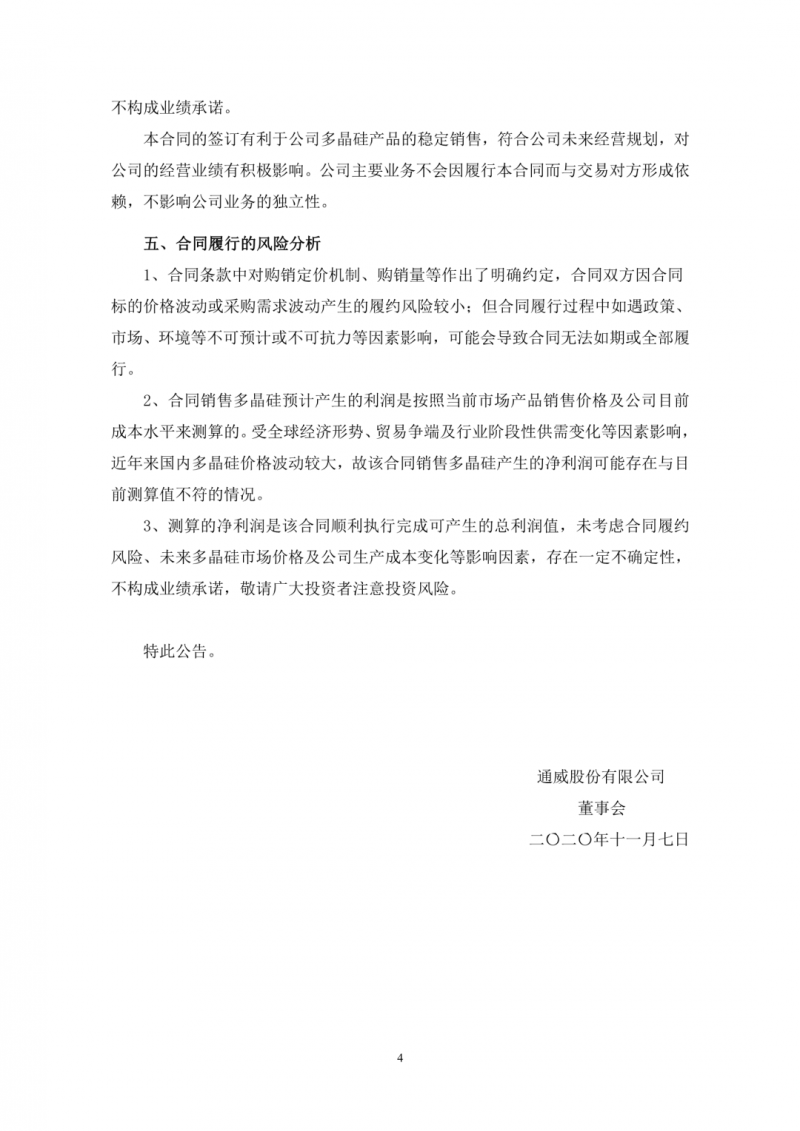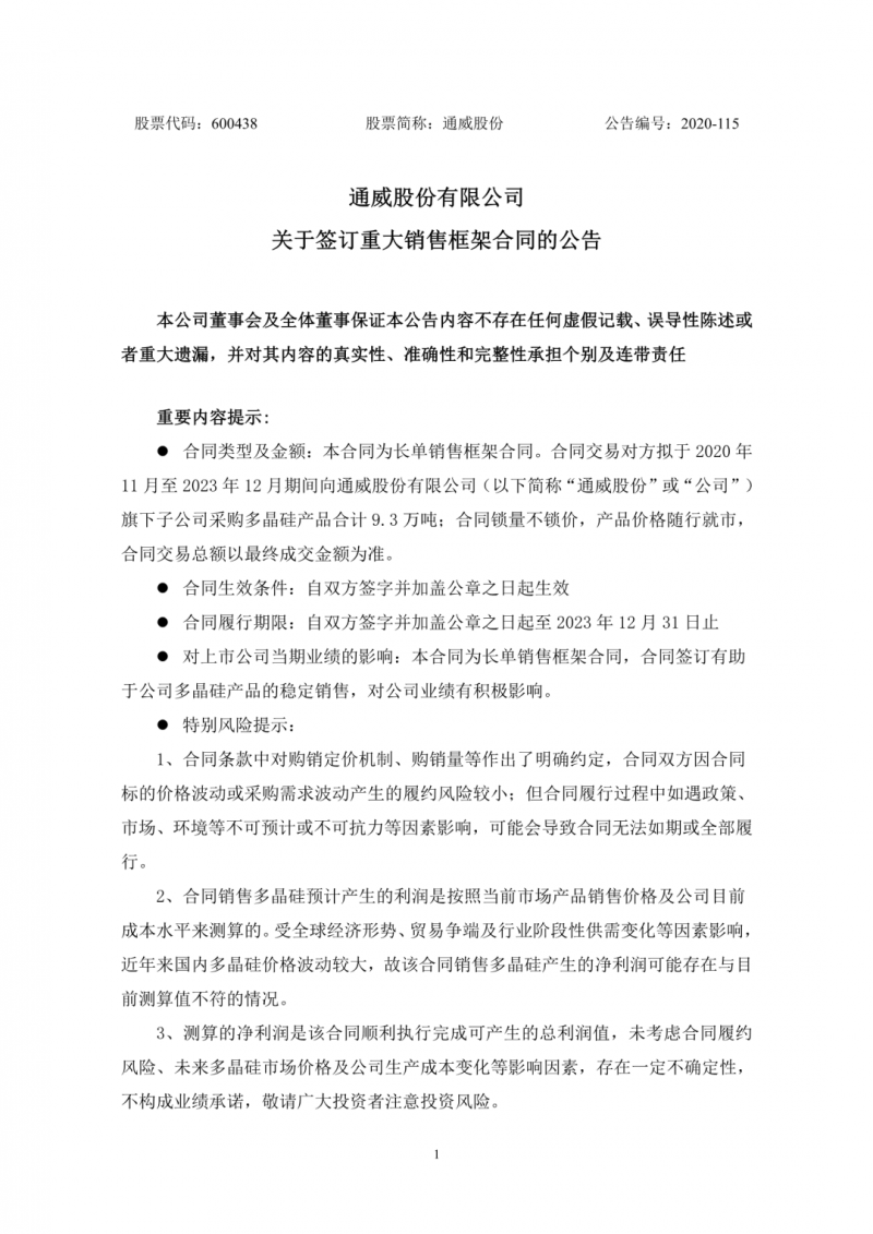 今日,通威股份發(fā)布公告稱,跟晶科能源簽訂大額銷售框架合同,合同約定 2020 年 11 月-2023 年 12 月期間,晶科能源及其子公司四川晶科向通威股份下屬永祥多晶硅、永祥新能源、內蒙通威、云南通威合計采購多晶硅 9.3 萬噸。同時表示,合同鎖量不鎖價,產(chǎn)品價格隨行就市,交易總額已最終成交金額為準。