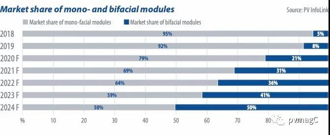 雙面組件可用于沙漠等高反射區域,與跟蹤器結合能優化發電。另一方面,用雙面電池組裝成的反射式背板結構單面組件,能提高組件正面的額定功率。例如,基于M6雙面電池的60-電池單面組件可將功率輸出提高1至2 W。從需求角度看,2019年下半年,中國約30%的公用事業規模項目使用了雙面太陽能組件。