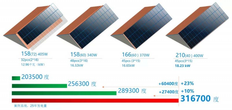 相比158組件,210相同屋頂面積提升6.6%的裝機容量,系統BOS成本每瓦節省7分錢。屋頂的利用率更高,項目收益率也顯著提升。