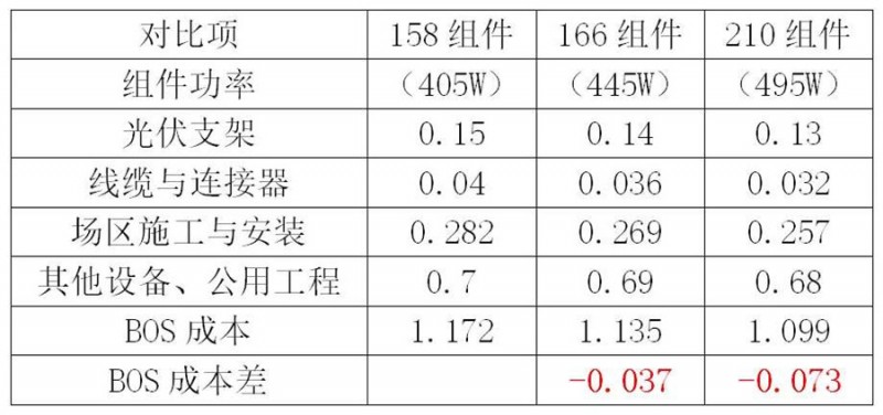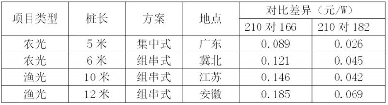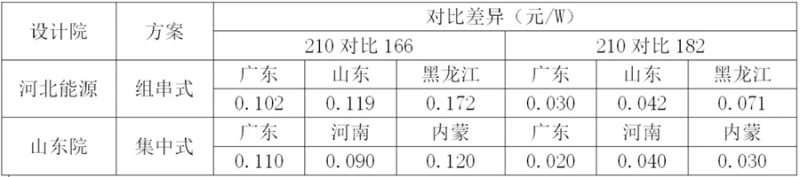 210產品的550W、600W以及660W,都是為大型地面電站設計的產品,目前進入量產的型號是550W。我們搜集了河北能源工程設計院和山東電力工程咨詢院兩家單位對于此款型號在不同緯度項目的系統造價差異對比結果,如下表:
