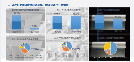 此外,在生產制造方面,得益于182產品配套的成熟,日前組件已經逐步進入量產階段。“182拉晶與158產品成晶率基本持平,后續還有一定提升空間,切片環節良率雖略低但很快將與158硅片達到持平狀態,電池效率通過各環節優化工藝可以提升至23.1%。目前組件量產效率已達到21%以上,運輸方面與158/166產品相比較,每個集裝箱可以多裝10%~20%瓦左右”,晶澳高級副總裁助理資深產品技術專家王夢松強調,更重要的是,182產品在拉晶、切片、電池、組件方面每道工序都有多個合格的供應商。預計2021年可供應182產品的拉晶、玻璃、膠膜產能“都在50%以上,拉晶占比更是高達91.7%。