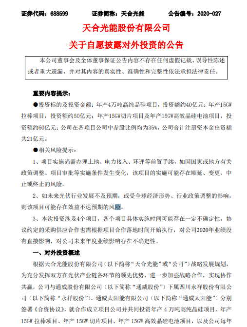 光伏產(chǎn)業(yè)鏈各環(huán)節(jié)的領(lǐng)先優(yōu)勢,進(jìn)一步加強(qiáng)戰(zhàn)略合作,實(shí)現(xiàn)協(xié)作共贏,天合光能與通威股份有限公司下屬四川永祥股份有限公司、通威太陽能有限公司分別簽署《合資協(xié)議》,就合作成立項(xiàng)目公司并共同投資年產(chǎn) 4 萬噸高純晶硅項(xiàng)目、年產(chǎn)15GW 拉棒項(xiàng)目、年產(chǎn) 15GW 切片項(xiàng)目、年產(chǎn) 15GW 高效晶硅電池項(xiàng)目,以及公司每年向合作項(xiàng)目公司采購高效晶硅電池等相關(guān)事項(xiàng)達(dá)成合作協(xié)議。根據(jù)協(xié)議約定,公司在各項(xiàng)目公司中參股比例均為35%,合計注冊資本出資額約為21億元。