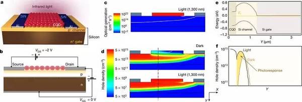 這種Si:CQD PVFET具有高增益、寬譜響應(包含紅外波段)、高響應速度和包含暗電流等優點。其性能可以通過先進的硅工藝進一步提升。該工作亮點在于,將成熟的硅電子工藝和CQDs的突出優勢相結合,發明出兩者兼有并互補的新型器件結構。該工作對于理解基于光伏效應和跨導增益的探測機制有很大的杠桿促進作用。