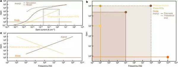 c PVFET、光電導元件和光-FET的增益-頻率關系模型。