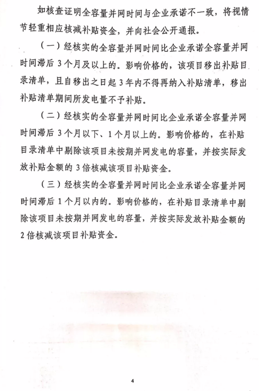 對于“部分并網保電價”的項目而言,這一辦法可能帶來較大影響。根據《辦法》規定,如經核實的全容量并網時間比企業承諾全容量并網時間滯后3個月及以上,該項目移出補貼目錄清單,且自移出之日起3年內不得再納入補貼清單,移出補貼清單期間所發電量不予補貼。如經核實的全容量并網時間比企業承諾全容量并網時間滯后3個月以下、1個月以上,在補貼目錄清單中剔除該項目未按期并網發電的容量,并按實際發放補貼金額的3倍核減該項目補貼資金。對于全容量并網時間比企業承諾全容量并網時間滯后1個月以內的項目,在補貼目錄清單中剔除該項目未按期并網發電的容量,并按實際發放補貼金額的2倍核減該項目補貼資金。
