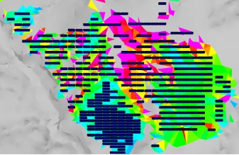 第四步:輔助分析布置間距。此時的山體被“解析”成了許多三角形,軟件會根據預設的擬布置方陣尺寸和傾角對每一個“三角形”進行分析計算,得到適合的布置間距。軟件對三角面的解析以及一些其他的分析計算量特別大,越復雜的山體對計算機的配置要求越較高。建議采用有獨立的顯卡的計算機,內存建議16G。