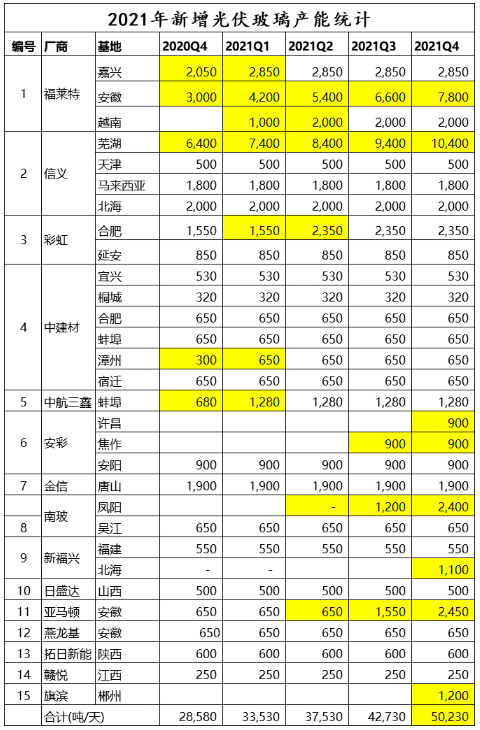 2021年是光伏玻璃產能投放的大年,光伏玻璃將會經歷緊缺、結構性緊缺、和全面滿足需求的階段。下面這張表格是我分季度統計的各家明年新增產能情況,其中標黃的位置代表產能發生變化的時間節點: