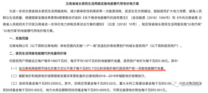 根據云南省人民政府2016年7月29日下發的《云南省城鄉居民生活用能實施電能替代用電價格方案的通知》,豐水期執行的是不高于0.172元/kWh的統購價格!
