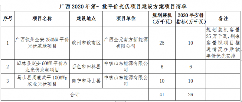 根據《國家能源局關于2020年風電、光伏發電項目建設有關事項的通知》(國能發新能〔2020〕17號)要求,我局根據競爭性配置評分結果及廣西電網有限責任公司消納意見,統籌制定了2020年平價風電和第一批平價光伏項目建設方案,現印發給你們,并就有關事項通知如下: