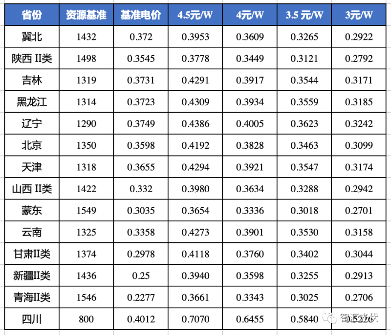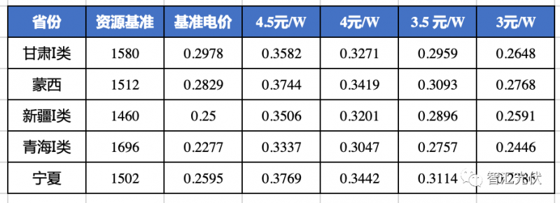 青海、寧夏的基準電價比3元/W時的反算電價還低,說明即使在3元/W,這兩個省的光伏項目,也很難以基準價實現8%的收益。