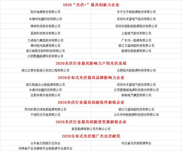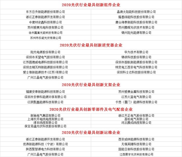 「PV TOP 50」2020光伏創(chuàng)新榜發(fā)布了“2020光伏行業(yè)最具創(chuàng)新力品牌服務(wù)商50強(qiáng)”榜單,并評選出:“2020光伏行業(yè)最具創(chuàng)新電池片/組件企業(yè)”、“2020光伏行業(yè)最具創(chuàng)新逆變器企業(yè)”、“2020光伏行業(yè)最具創(chuàng)新零部件及電氣配套企業(yè)”、“2020光伏行業(yè)最具創(chuàng)新支架企業(yè)”、“2020“光伏+”最具創(chuàng)新力企業(yè)(儲能、氫能、BIPV、金融、農(nóng)業(yè)、互聯(lián)網(wǎng)等)”、“2020光伏行業(yè)最具創(chuàng)新運(yùn)維企業(yè)”、“2020光伏行業(yè)最具影響力戶用光伏系統(tǒng)”、“2020分布式光伏最具品牌影響力企業(yè)”等八大創(chuàng)新獎(jiǎng)項(xiàng)。