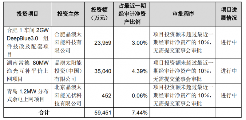 此外,根據(jù)公告,晶澳太陽能近期還有3個正在審批中且尚未達到董事會審議標(biāo)準(zhǔn)的對外投資事項,3個項目投資總額達5.9451億元,分別為:合肥1車間2GWDeepBlue3.0組件技改及配套項目、湖南常德80MW漁光互補平價上網(wǎng)項目、青島1.2MW分布式余電上網(wǎng)項目。公告顯示以上三個項目項目投資額未超過最近一期經(jīng)審計凈資產(chǎn)的10%,無需提交董事會審批。詳情如下: