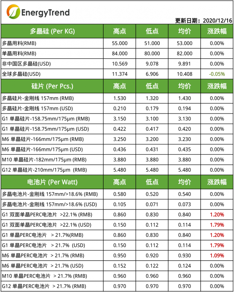 原標題:EnergyTrend12月16日光伏產業供應鏈價格