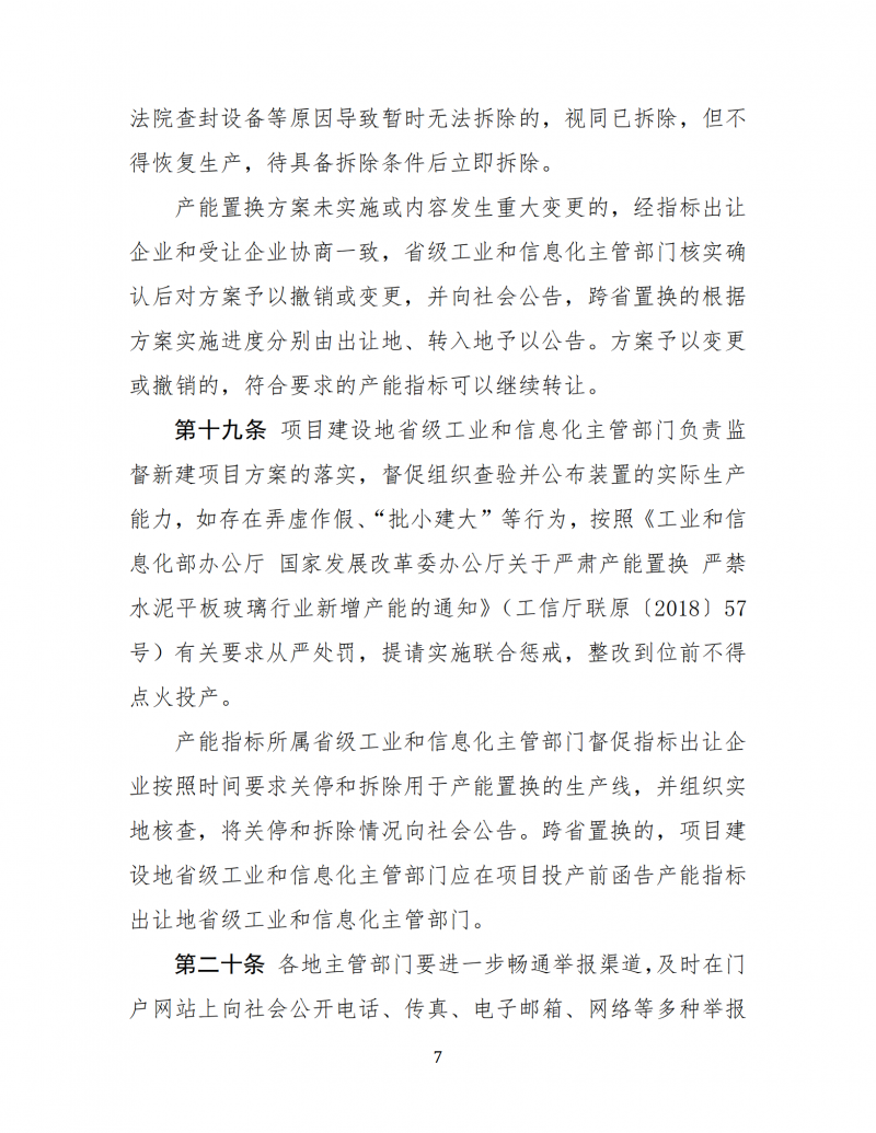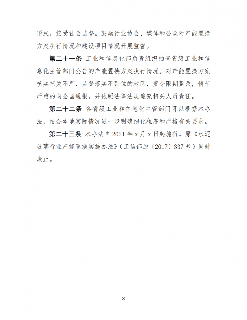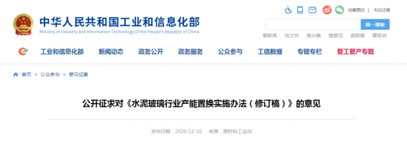 為進(jìn)一步聽取社會(huì)各界意見,現(xiàn)予以公示,公示日期截止2021年1月19日。如有意見或建議,請(qǐng)?jiān)诠酒陂g填寫《公示意見反饋信息表》(見附件2)并反饋至工業(yè)和信息化部原材料工業(yè)司,電子郵件發(fā)送至yclsjcc@miit.gov.cn(郵件主題注明:水泥玻璃行業(yè)產(chǎn)能置換實(shí)施辦法公示意見反饋)。