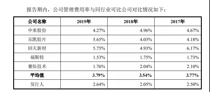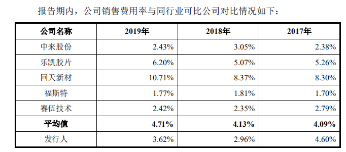 銷售費用率方面,2019年明冠新材的比值是3.62%,要高于賽伍技術、福斯特和中來股份,但是低于4.71%的行業均值。