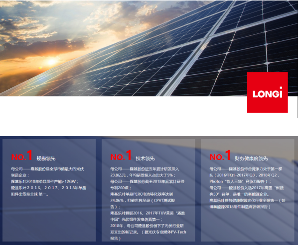 隆基股份成立于2000年,是全球最具價值的太陽能科技公司。2016-2018年單晶組件出貨量全球第一,單晶PERC電池轉化效率達到24.06%打破世界紀錄,并蟬聯2016、2017年TUV萊茵“質勝中國”光伏組件發電仿真第一。