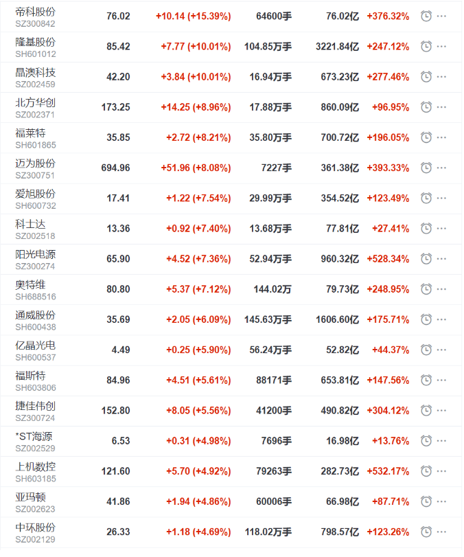 隆基股份跳空高開8.18%,一口氣沖上3000億市值。截至午間收盤,隆基股份漲停,報收85.42元/股,成交74.21億元,總市值3221億元,較前一交易日暴漲292億元,股價和市值創出歷史新高。