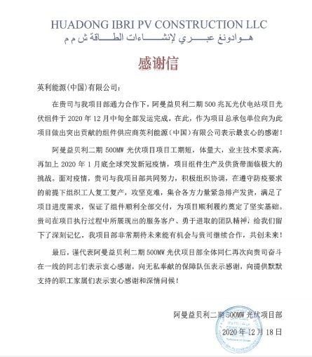 項目部發送給英利的感謝信