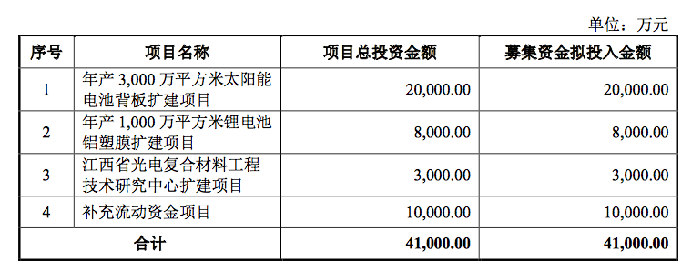 根據(jù)招股說明書顯示,明冠新材將募集4.1億資金用于年產(chǎn)3000萬平方米太陽能電池背板擴(kuò)建項(xiàng)目、年產(chǎn)1000萬平方米鋰電池鋁塑膜擴(kuò)建項(xiàng)目、江西省光電復(fù)合材料工程技術(shù)研究中心擴(kuò)建項(xiàng)目、補(bǔ)充流動(dòng)資金項(xiàng)目。