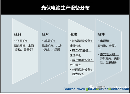 光伏設備環節:從上游的多晶硅料開始,到光伏組件,對應核心的設備分別為多晶硅還原爐、單晶硅直拉爐、切片機/截斷機、電池片設備、組件自動化設備。