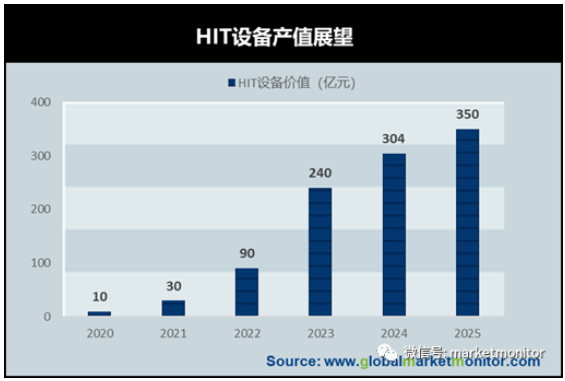 由于PERC無法升級到HIT,電池廠將開啟新一輪的資本開支周期,設備價格預計從5億先降到4億,未來有潛力降到3.5億,對應2020-2025年設備產值10、30、90、240、304、350億元。