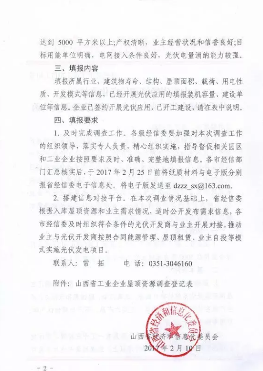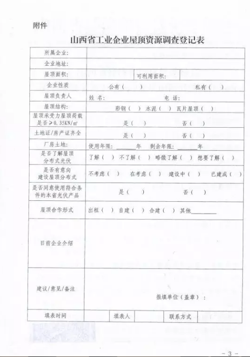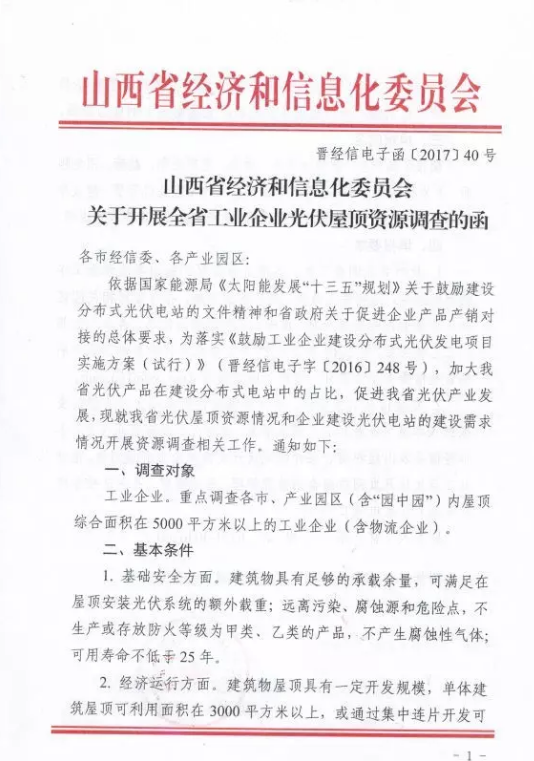 昨日,記者從山西省經信委獲悉。為落實山西省鼓勵工業企業建設分布式光伏發電 項目實施方案 (試行)政策。2月10日,山西省經信委印發《關于開展全省工業企業光伏屋頂資源調查的函》晉經信電子函〔2017〕40號文件。要求全省經信委、產業園區對轄區內符合條件的工業企業進行資源調查。并于2月22日之前將紙質材料上報。