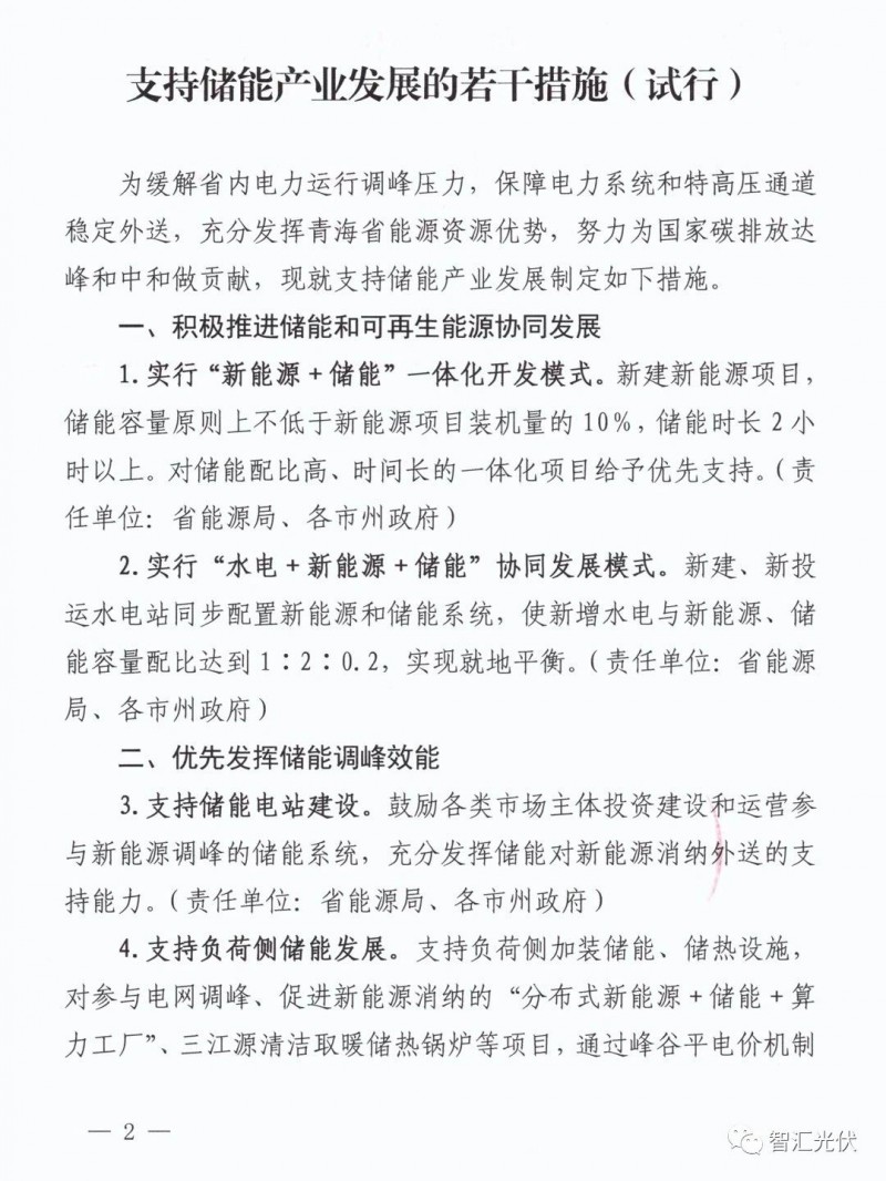 1)將實行“新能源+儲能”一體化開發模式。新建新能源項目,儲能容量原則上不低于新能源項目裝機量的10%,儲能時長2小 時以上。對儲能配比高、時間長的一體化項目給予優先支持。