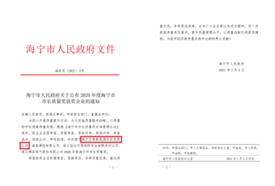 據悉,海寧市市長質量獎是市政府對市內從事產品生產、工程建設、服務提供、環境保護的企業(組織)實施卓越績效管理,并在行業內處于領先地位、取得顯著經濟效益和社會效益的最高質量獎勵。2020年海寧市共有21家企業申報角逐年度市長質量獎,歷時6個月,經過資格審查、資料評審、現場評審、審查表決、初選公示、審定批準等環節,最終海寧正泰新能源等4家企業脫穎而出,榮獲海寧市市長質量獎。