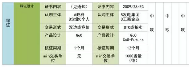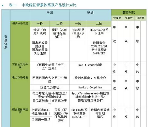 表中依據圖一思路做了中歐能源體系中主要分支羅列對比,以及綠色證書設計的一些不同之處,并且將各項指標按照完成度、關聯性和可延展性進行大致分級,綠色的深淺表示各對比項的完成情況。