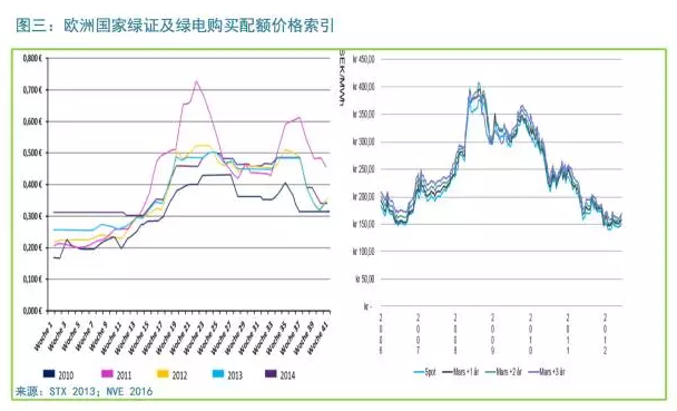 歐洲國家中實行綠電配額制的國家有英國、意大利、瑞典、挪威、波蘭及羅馬尼亞,其它國家的綠證交易只是電力來源標識規定下的自由交易。綠電強制配額和綠證有著相似之處,但是綠證和綠電配額交易是互不相通的,綠證持有不可以抵消綠電配額。從二者價格區別上可以更加明確這一點,圖左是北歐斯堪的納維亞水電站從2010到2014年間的綠證價格發展,基本在0.2歐/MWh到0.8歐/MWh之間浮動,其中2011年3月的福島第一核電站事故刺激綠證價格大幅上抬(紫色折線),隨后又歸于平穩。圖右是2006到2012年挪威的綠電配額elcert價格,最高可達38歐/MWh(376SEK/MWh)。綠證及綠證強制配額價格間的巨大差異與政策推行的目的達成呈正相關,卻又影響強制配額執行方的利益發展,所以二者之間的平衡點或者其它創新或許可成為新的模式。
