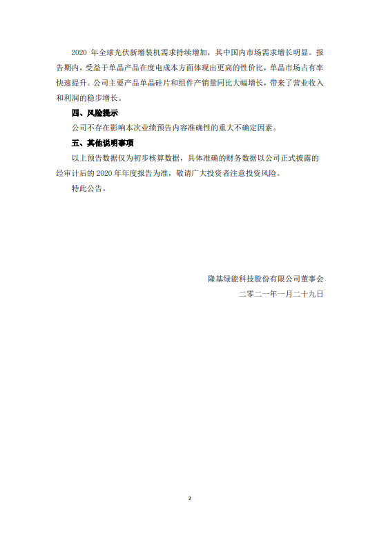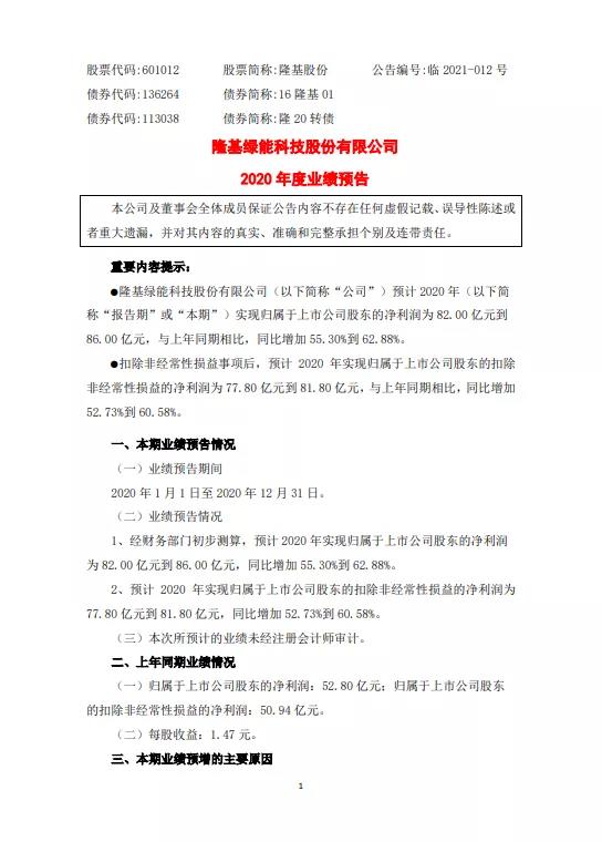 公告稱,2020年業(yè)績預(yù)增的主要原因是2020年全球光伏新增裝機(jī)需求持續(xù)增加,其中國內(nèi)市場需求增長明顯。受益于單晶產(chǎn)品在度電成本方面體現(xiàn)出更高的性價(jià)比,單晶市場占有率快速提升。公司主要產(chǎn)品單晶硅片和組件產(chǎn)銷量同比大幅增長,帶來了營業(yè)收入和利潤的穩(wěn)步增長。