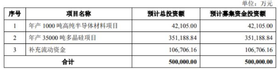 根據招股書內容顯示,新疆大全此次公開發行股票的數量不低于2.87億股不超過3.0億股,募集資金50億元,在發行后總股份中所占比例不低于15.00%,主要用于年產1000噸的高純半導體材料項目、年產35000噸多晶硅項目以及補充流動資金之用。