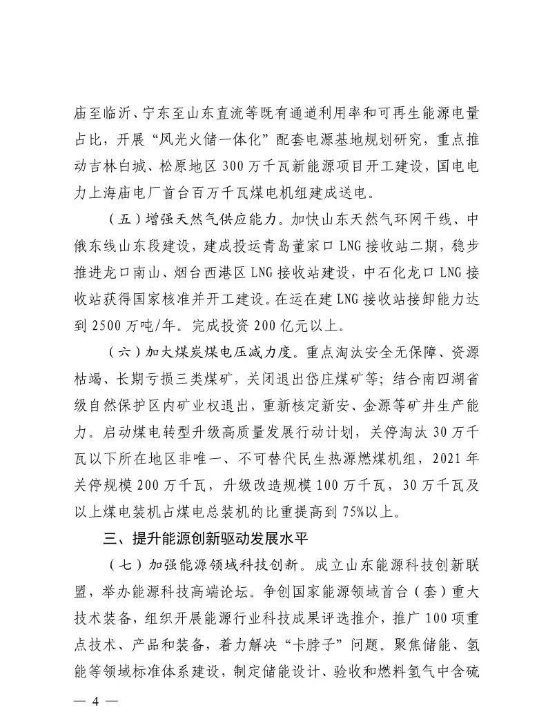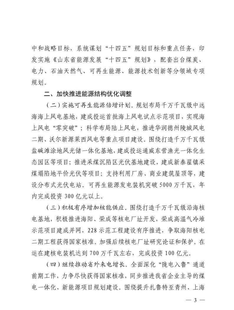 2月19日,為統籌做好2021年全省能源工作,加快推動新時代能源行業高質量發展,山東省能源局研究制定了《2021年全省能源工作指導意見》(以下簡稱《意見》),對2021年全省能源發展工作作出指導性部署安排。《意見》提到,到2021年底,山東省新能源和可再生能源發電裝機達到5200萬千瓦以上,占電力總裝機比重達到32%以上;煤電裝機控制在1億千瓦左右,占電力總裝機比重66%左右。2021年,煤炭產量穩定在1.1億噸左右;天然氣供應量220億立方米以上;省外來電1200億千瓦時以上;能源基礎設施投資600億元以上。
