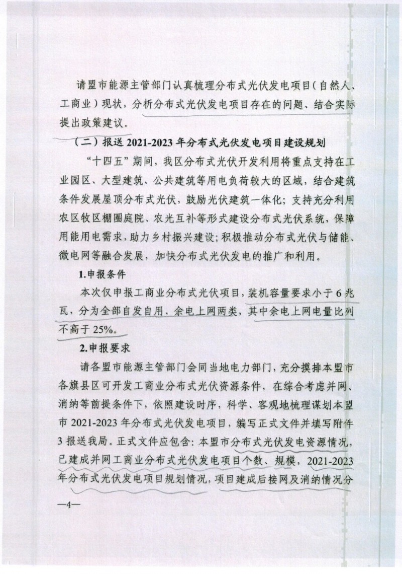分布式光伏:單體規模≤6MW,可選擇全部自發自用、余電上網兩類,其中余電上網電量比例不高于25%。