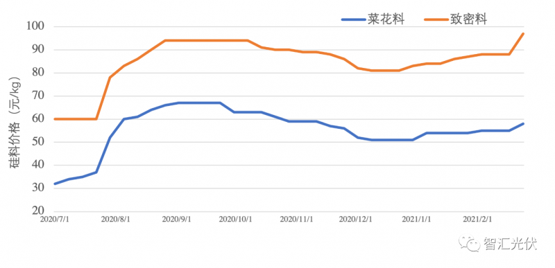 數(shù)據(jù)來源:PVInfolink圖:2020年下半年以來硅料的價(jià)格走勢(shì)