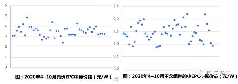 筆者2020年開標(biāo)的統(tǒng)計(jì)了104個(gè)EPC和小EPC(不含組件、逆變器)的價(jià)格發(fā)現(xiàn),光伏項(xiàng)目EPC(含組件、逆變器)加權(quán)平均中標(biāo)價(jià)格為3.28元/W;小EPC中標(biāo)價(jià)格(不含組件、逆變器)加權(quán)平均中標(biāo)價(jià)格為1.42元/W;如下圖所示。