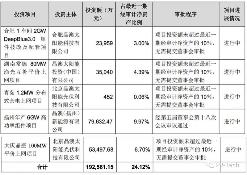 晶澳科技近期累計已經發生的且尚未達到股東會審議標準的對外投資事項,來源:公告