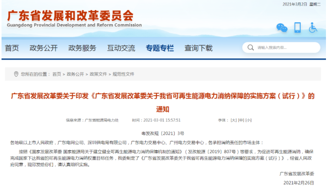 廣東省發展改革委關于我省可再生能源電力消納保障的實施方案(試行)