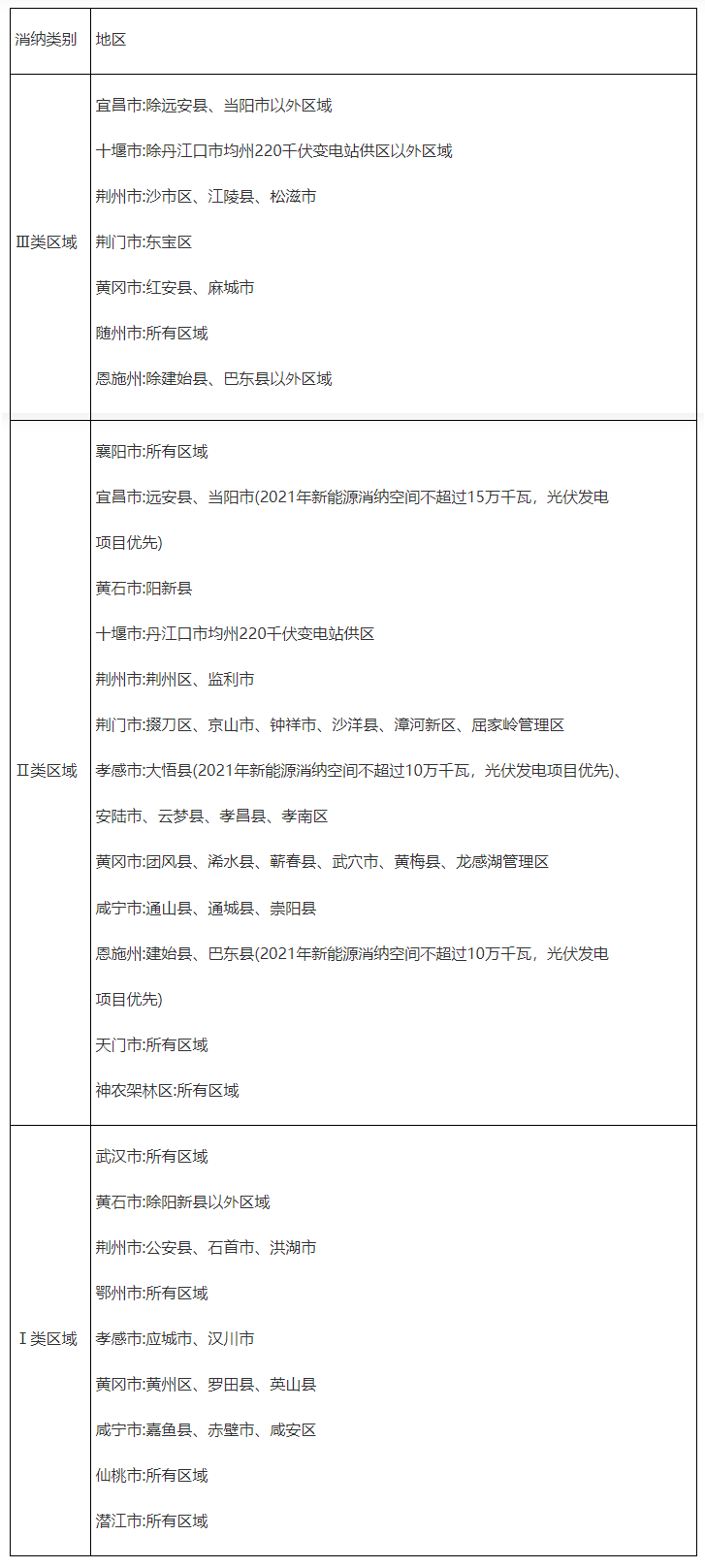 Ⅲ類區域為消納困難區域。包括宜昌市(除遠安縣、當陽市外)、十堰市(除丹江口市均州220千伏變電站供區外)、荊州市(沙市區、江陵縣、松滋市)、荊門市(東寶區)、黃岡市(紅安縣、麻城市)、隨州市、恩施州(除建始縣、巴東縣以外)。