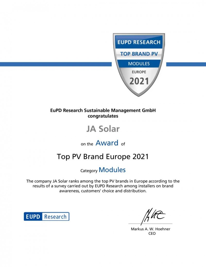 “頂級光伏品牌”是全球光伏行業認可度最高、最富盛名的光伏獎項之一,EuPD Research通過對不同國家、地區的光伏安裝企業和終端用戶進行深入調研,選出各方面表現卓越的光伏企業授予此項榮譽,其評選結果對客戶選擇高品質的光伏產品具有極強的參考價值。