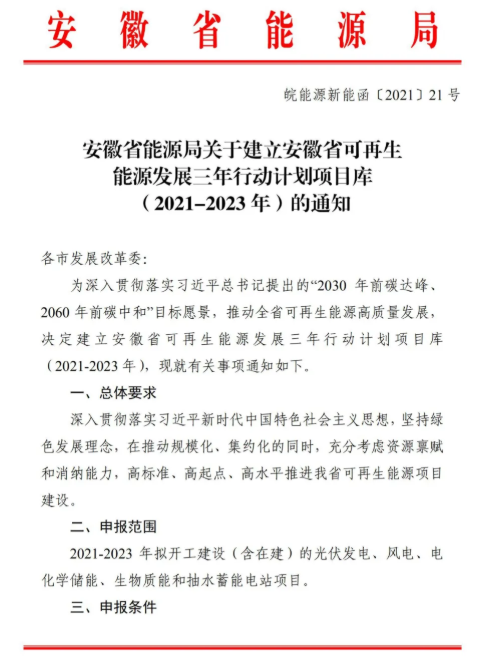 安徽:建立可再生能源未來三年項目庫,月底前報送到省能源局!