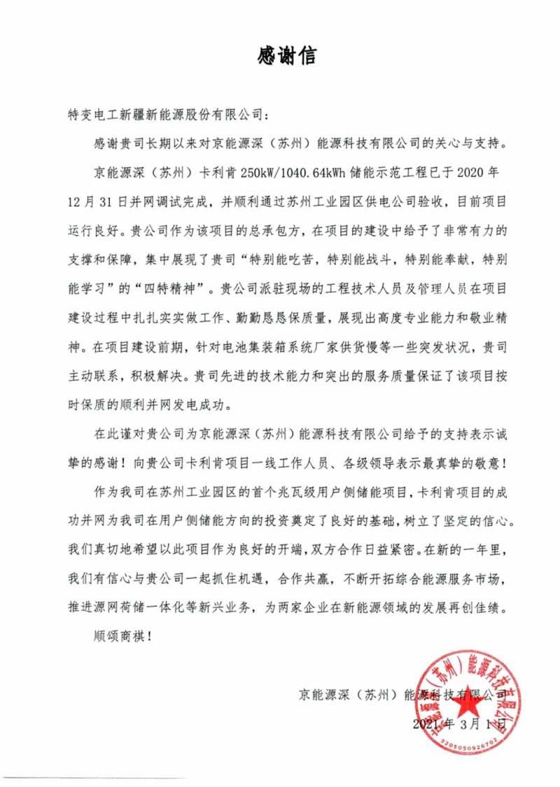 自項目開工以來,特變電工新能源微網產品線京能卡利肯儲能項目組精心組織施工,合理配置資源,積極與供電公司等部門溝通,嚴格落實安全文明施工及質量管理相關規(guī)定,克服了工期緊張、安裝調試困難等諸多不利因素,滿足項目高要求并網條件,順利通過蘇州電網驗收,實現并網運行,實現特變電工新能源在江蘇用戶側儲能市場的重要突破。同時,也幫助客戶在蘇州工業(yè)園區(qū)打開了儲能新業(yè)務拓展的大門,為企業(yè)園區(qū)節(jié)能增效做出了積極貢獻,獲得當地政府部門的肯定和認可。